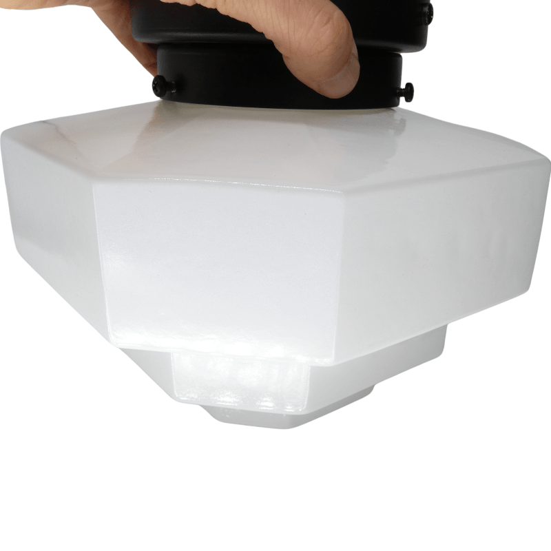 Aplique de pared original Scala, esta lámpara aplique para pared o techo está formada por una pequeña pieza de base (en latón o negro) y la original tulipa Scala con forma de pirámide opal (blanca).