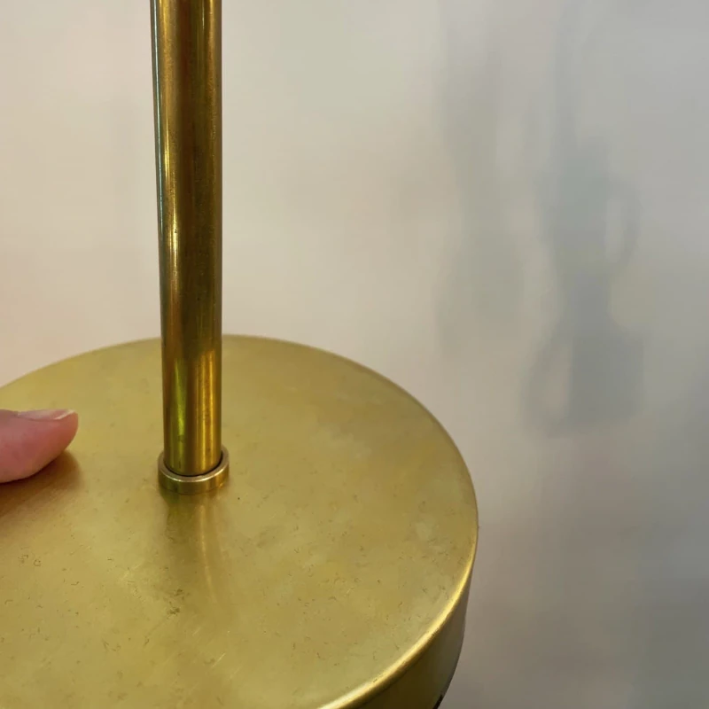 La base, la barra y la sujeción están hechos de latón bruto, material que cuando es nuevo se ve como un dorado mate y que con el tiempo, al no llevar ningún tratamiento, va oscureciendo pasando a ser un oro viejo, que le dará un toque aún más vintage.