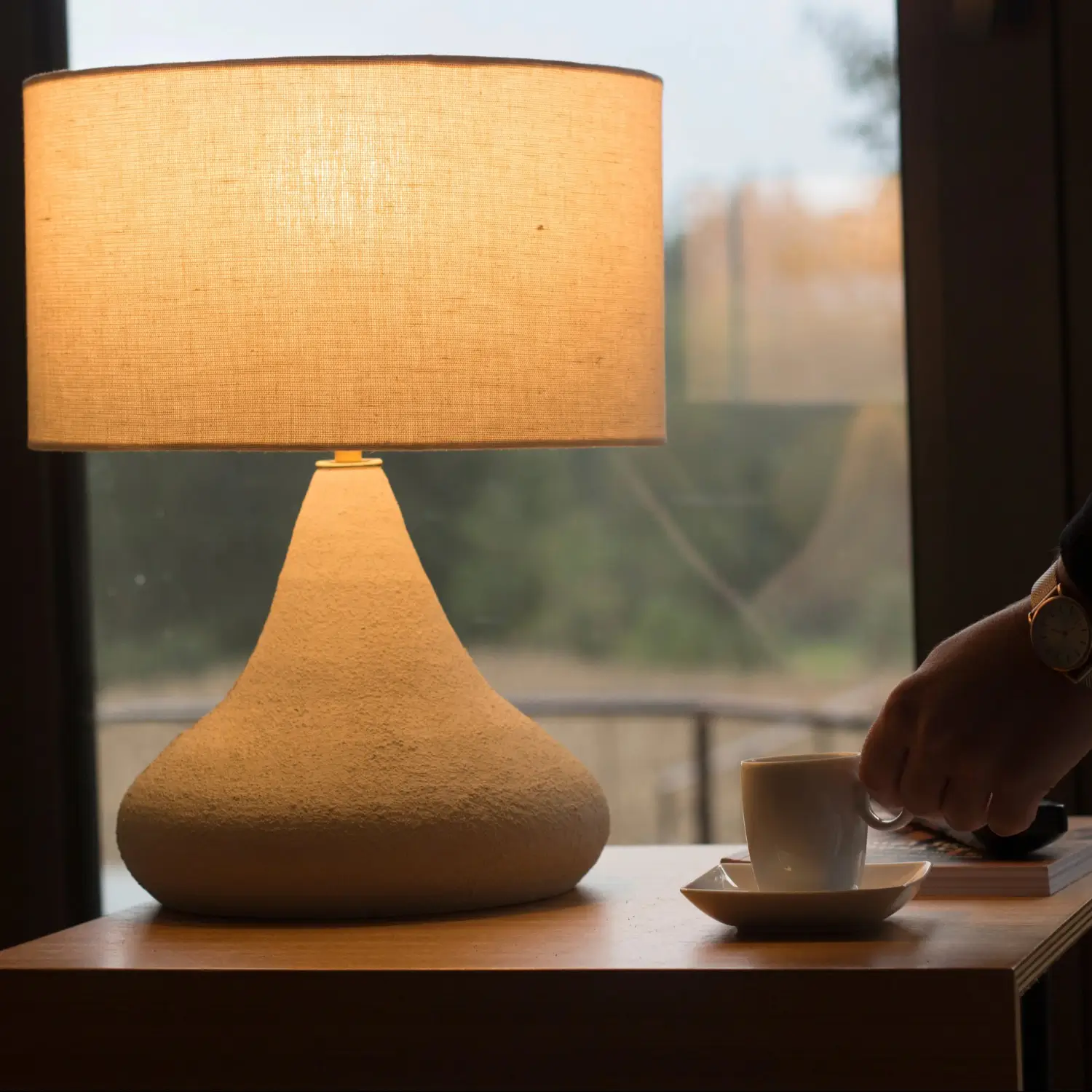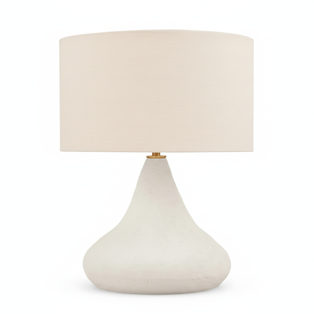 Cada base de cerámica está hecha a mano, con ligeras variaciones naturales que hacen que no haya dos lámparas iguales. La pantalla de lino filtra suavemente la luz, aportando una atmósfera relajante y sofisticada ideal para cualquier rincón de tu hogar.
