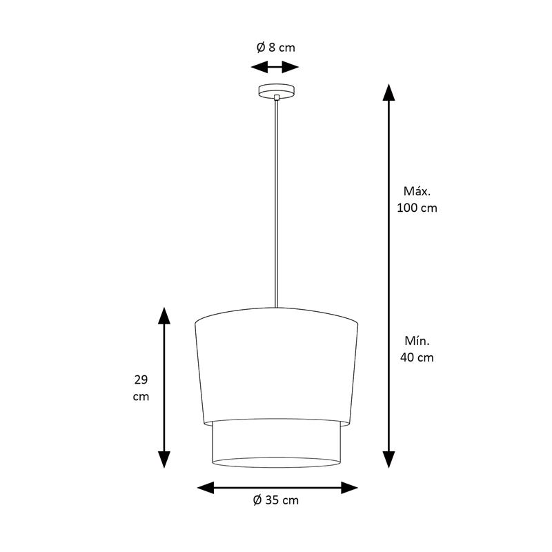 Esta lámpara de techo cuenta con dos pantallas que garantizan una iluminación óptima y equilibrada para todo tipo de espacios. El diámetro de la lámpara es de 35cm. Además, es regulable en altura, con un rango que va desde los 40 cm hasta los 120 cm, lo que te permite adaptarla perfectamente a techos altos o bajos según tus necesidades.
