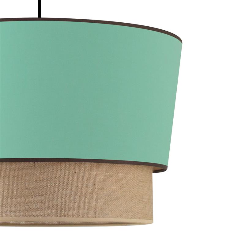 Lámpara colgante con pantalla de yute y pantalla de tela de color verde azulada, un equilibrio perfecto entre estilo natural y diseño moderno.