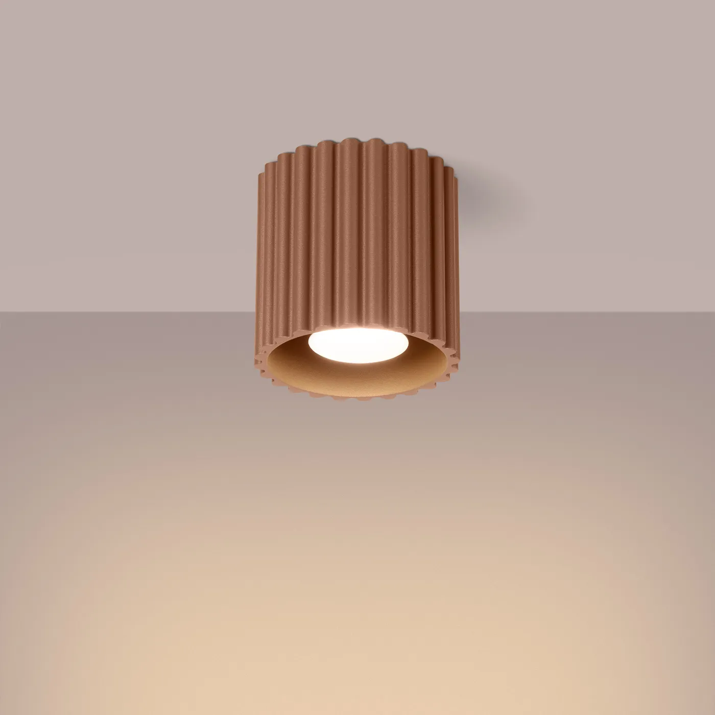 Lámpara de techo moca Aura 1 con casquillo GU10. Es la iluminación perfecta si te gusta el ambiente minimalista, industrial o simplemente quieres una lámpara que llame la atención pero sin monopolizar el espacio. Tiene forma redondeada con unas estrías muy características y atractivas.