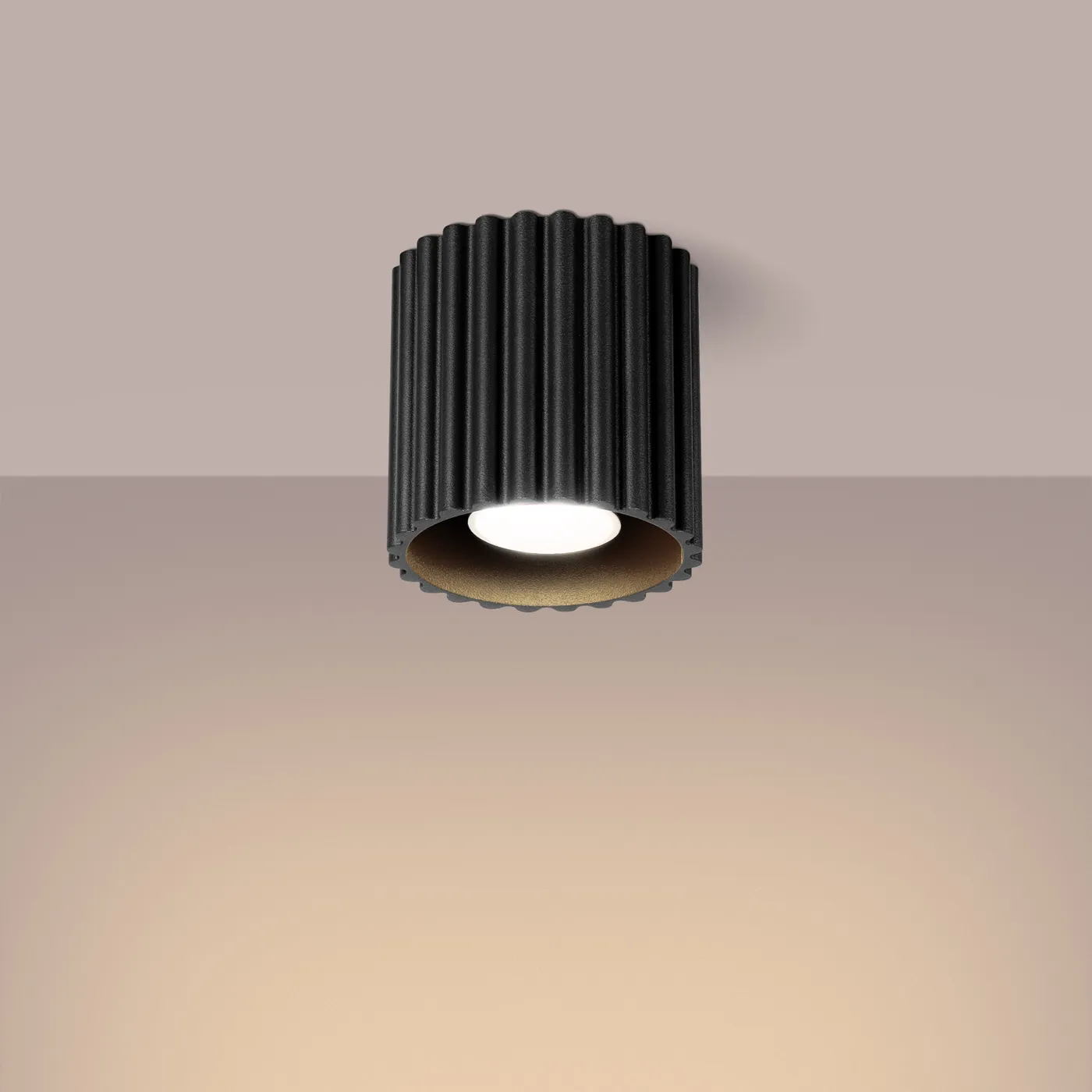 Lámpara de techo negra Aura 1 con casquillo GU10. Es la iluminación perfecta si te gusta el ambiente minimalista, industrial o simplemente quieres una lámpara que llame la atención pero sin monopolizar el espacio. Tiene forma redondeada con unas estrías muy características y atractivas.