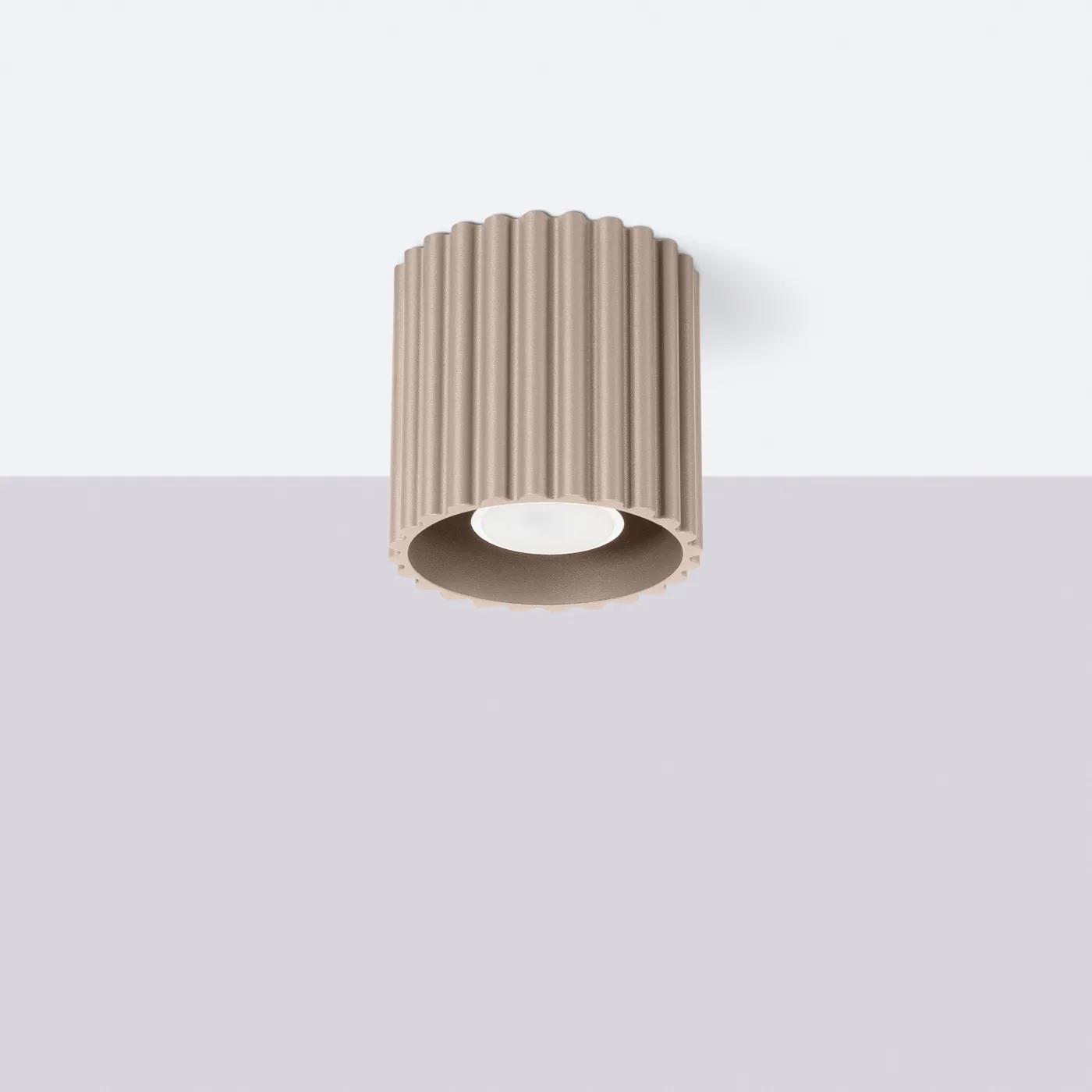 Lámpara de techo topo Aura 1 con casquillo GU10. Es la iluminación perfecta si te gusta el ambiente minimalista, industrial o simplemente quieres una lámpara que llame la atención pero sin monopolizar el espacio. Tiene forma redondeada con unas estrías muy características y atractivas.