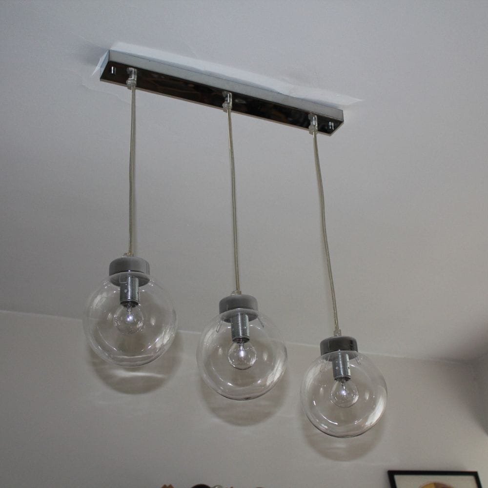 Lámpara de techo estilo industrial acabada en cromo de líneas sencillas. Tiene 3 globos transparentes que dan gran luminosidad. Puedes utilizar las bombillas de la potencia que quieras (hasta 60W por punto de luz) para crear un ambiente más luminoso o más íntimo.