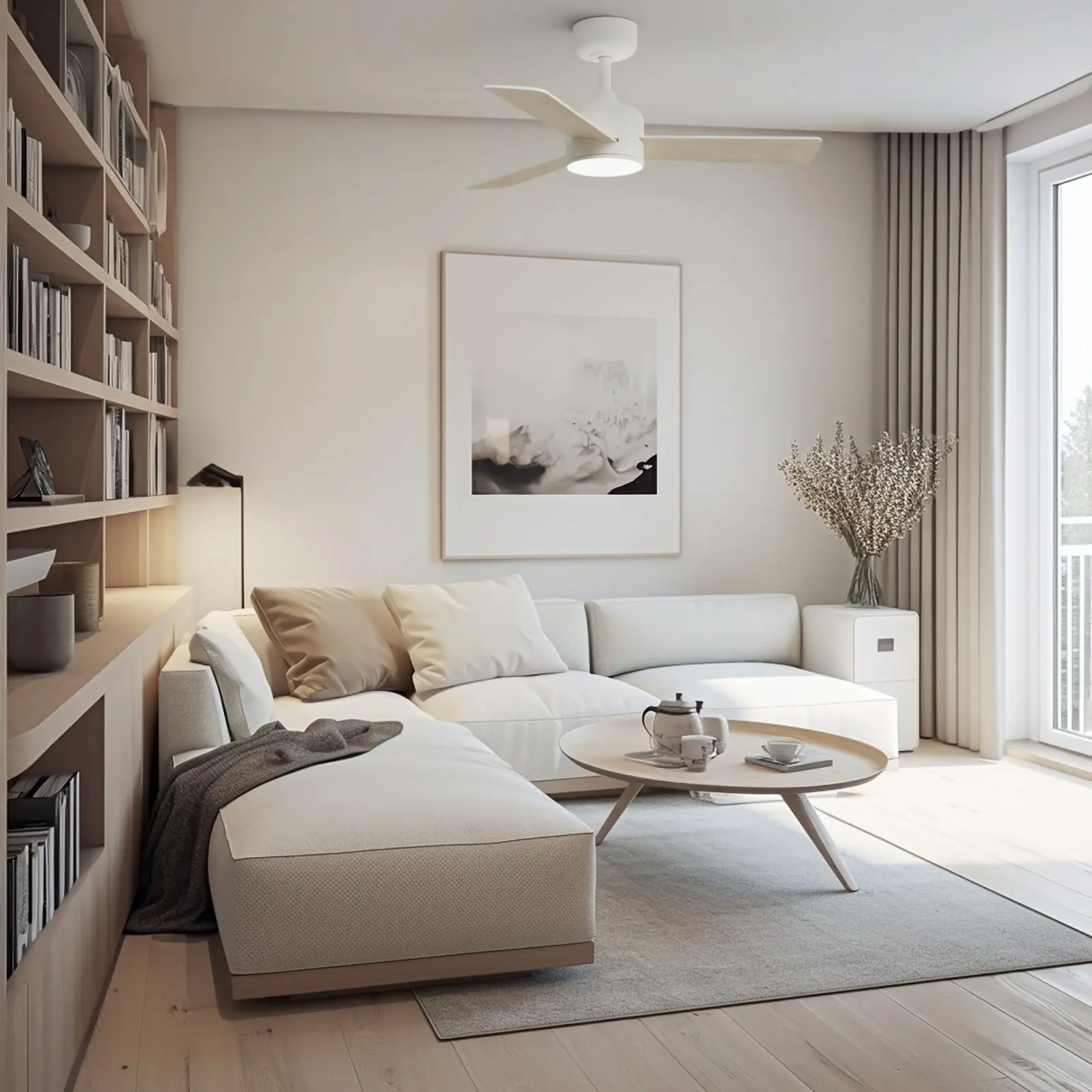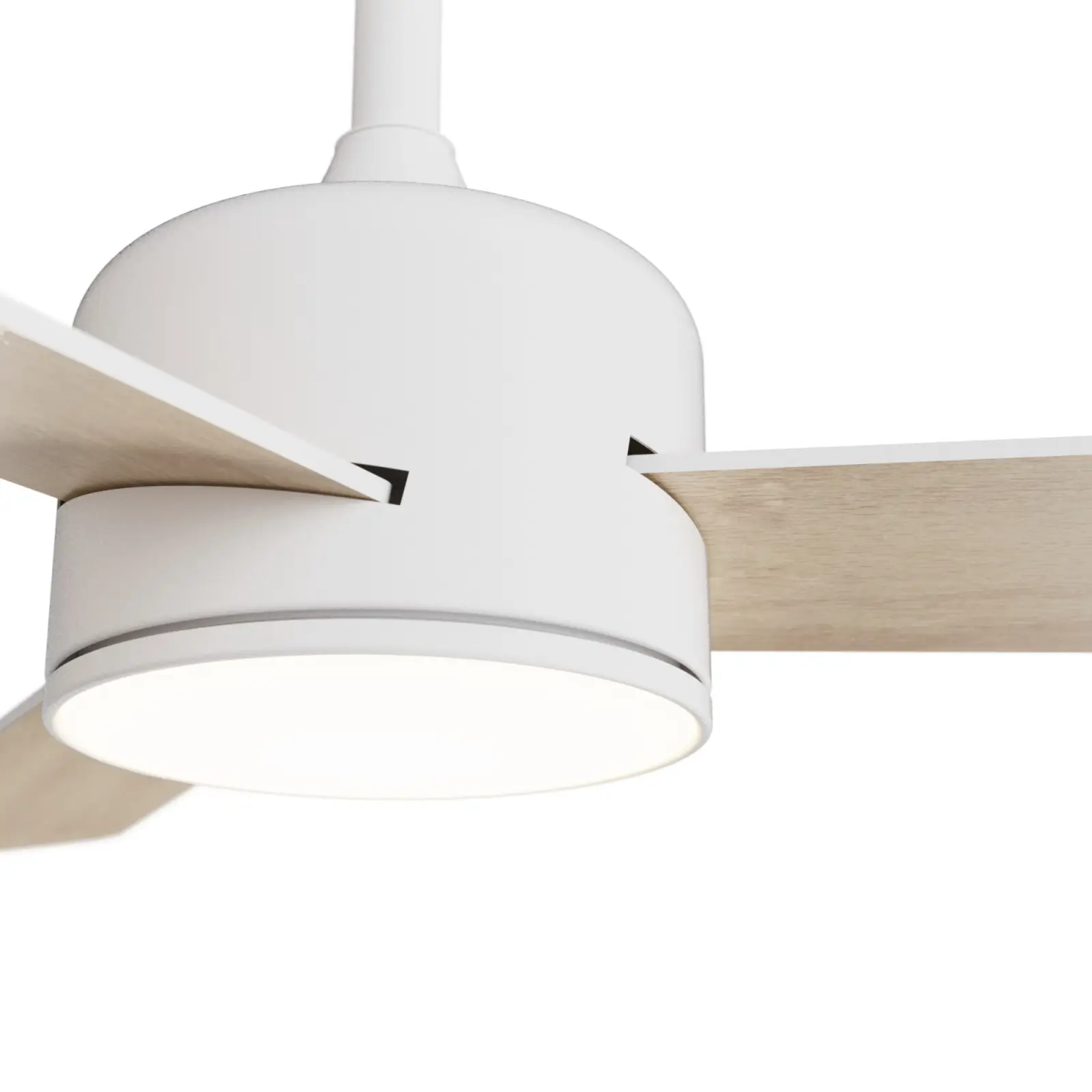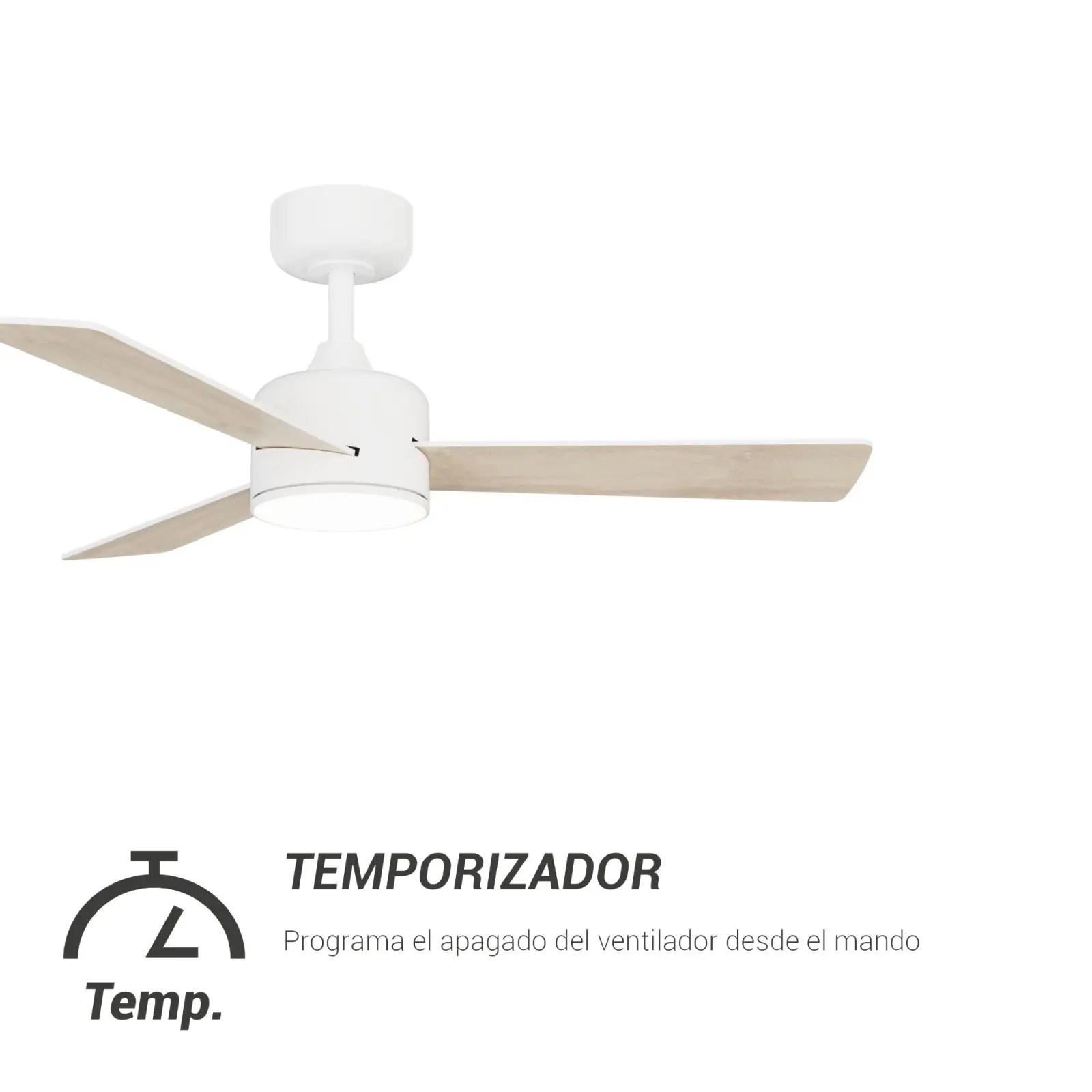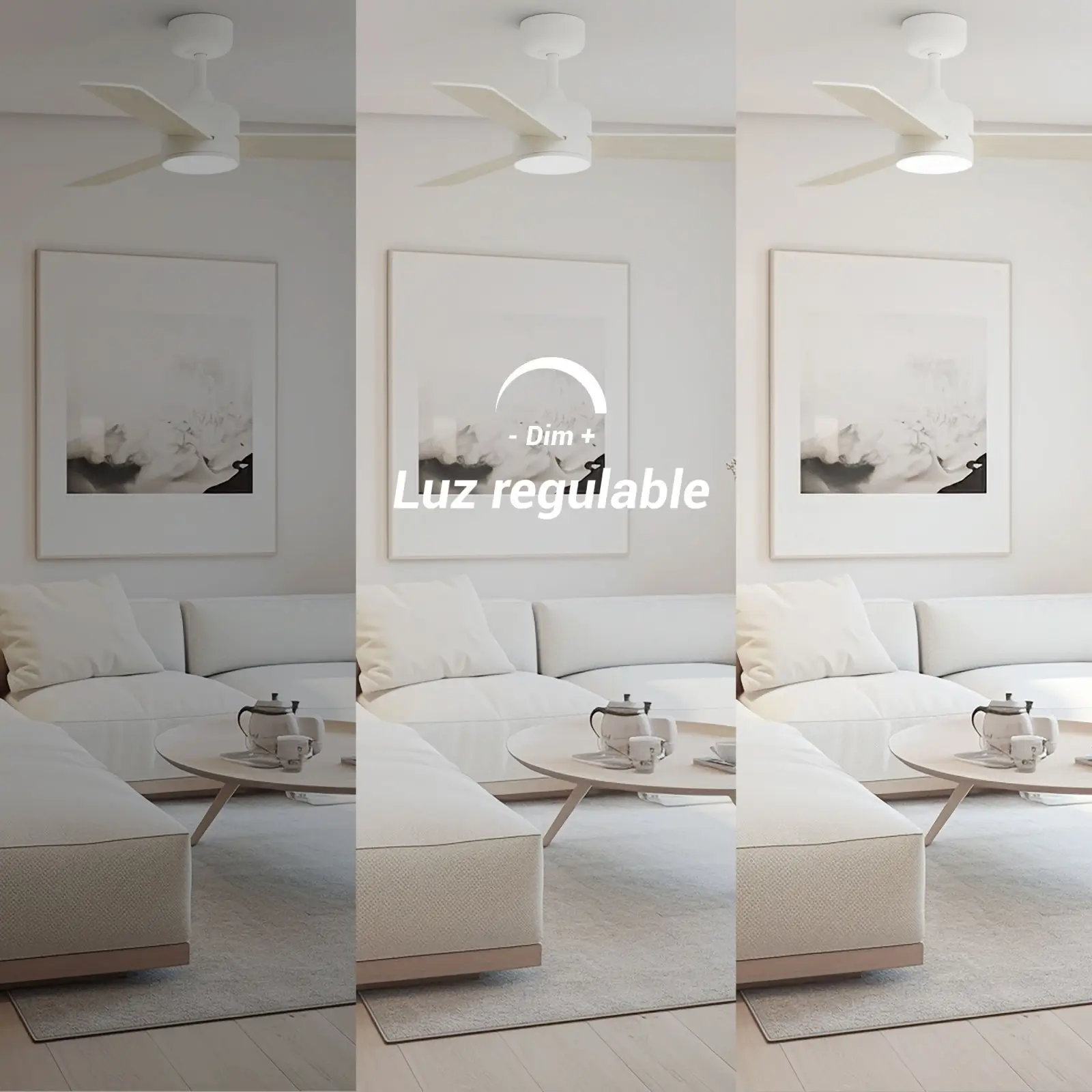 Ventilador de techo con luz LED, motor DC silencioso, reversible y de bajo consumo. Diseño elegante, ideal para verano e invierno.