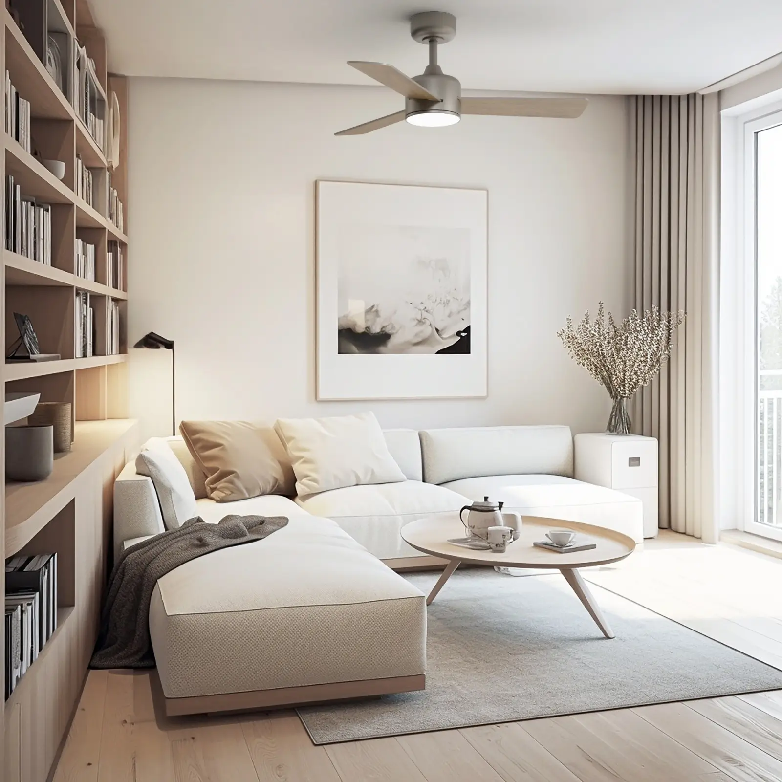 Ventilador de techo compacto de Sulion con luz LED regulable y palas reversibles. Silencioso, elegante, económico y perfecto para espacios pequeños.