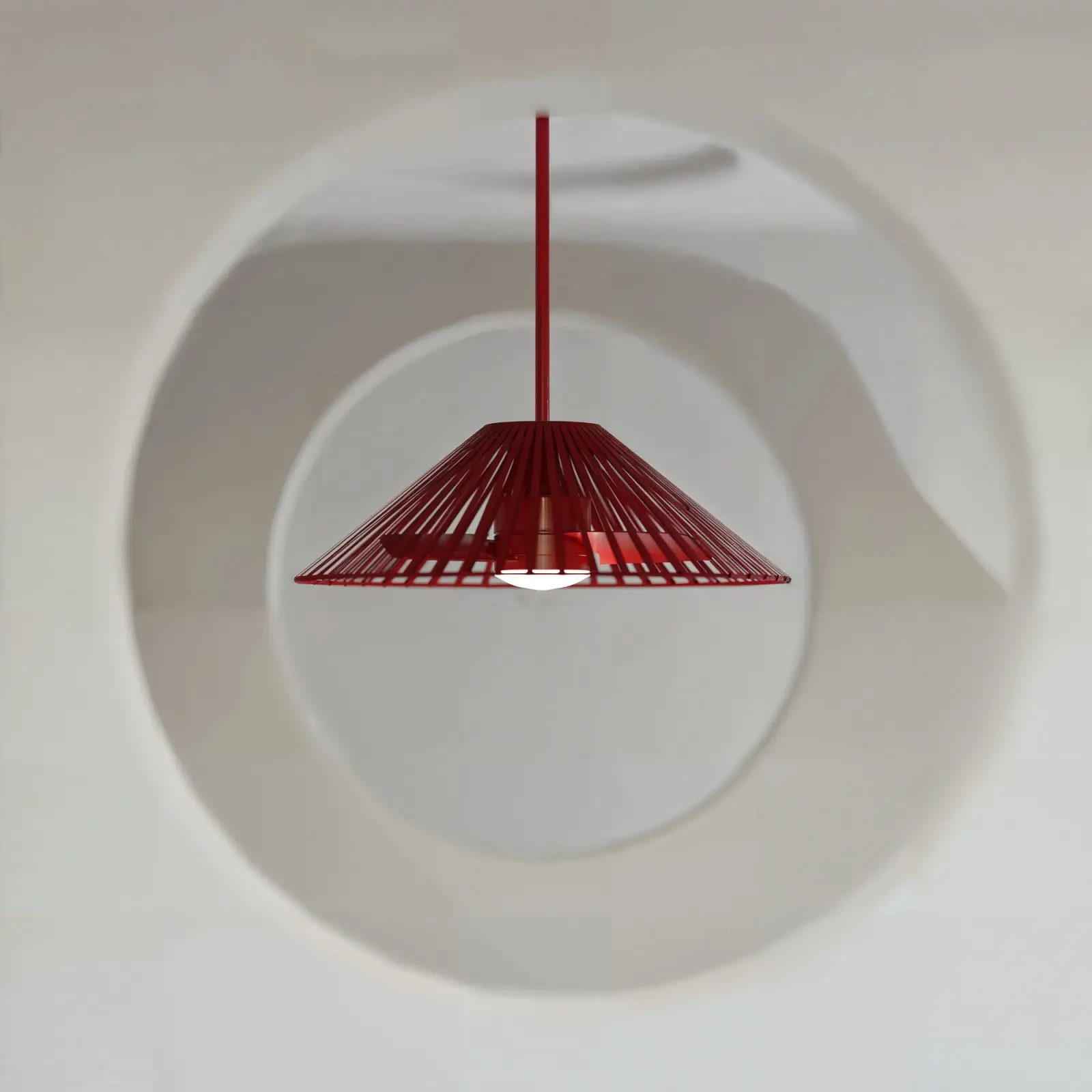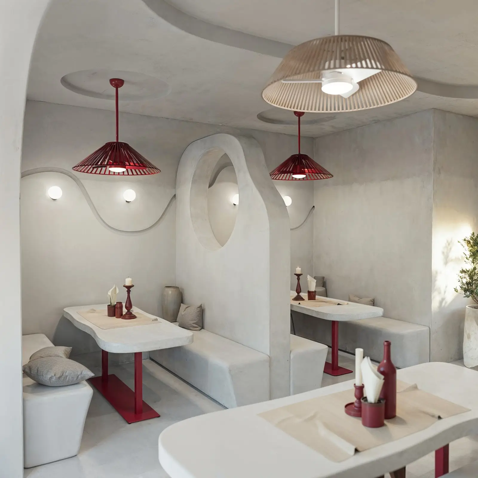 El ventilador Terra va bien en techos inclinados y está disponible en color burdeos, vamos, que es una fantasía